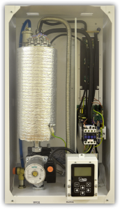Одноконтурный электрокотел РЭКО 30П. ТЭНы заключены в теплообменник с патрубками входа и выхода. На теплообменнике имеется выключатель перегрева, а так же датчик, замеряющий температуру теплоносителя на выходе. Компоненты управления и коммутации питаются напряжением через выключатель. Электрокотел полностью экологичен для окружающей среды.